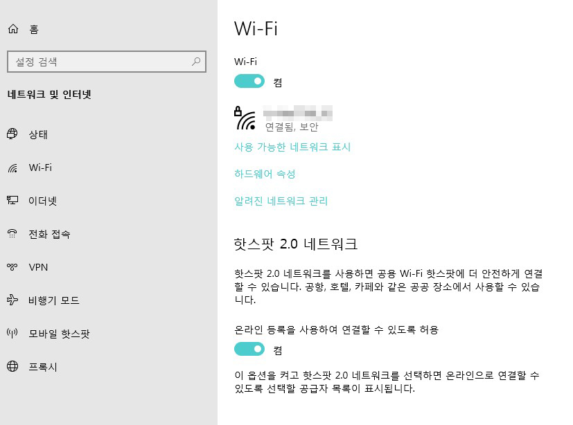 그리고 '설정 > 네트워크 및 인터넷'에 들어가 보니 메뉴에 와이파이가 생긴 것을 발견했습니다.